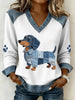 Women's Cute Dachshund Pattern Denim Patchwork Art V-Neck Top